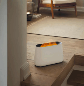 It has three functions: scent diffuser, humidifier, and “fireplace effect” (amber lighting).